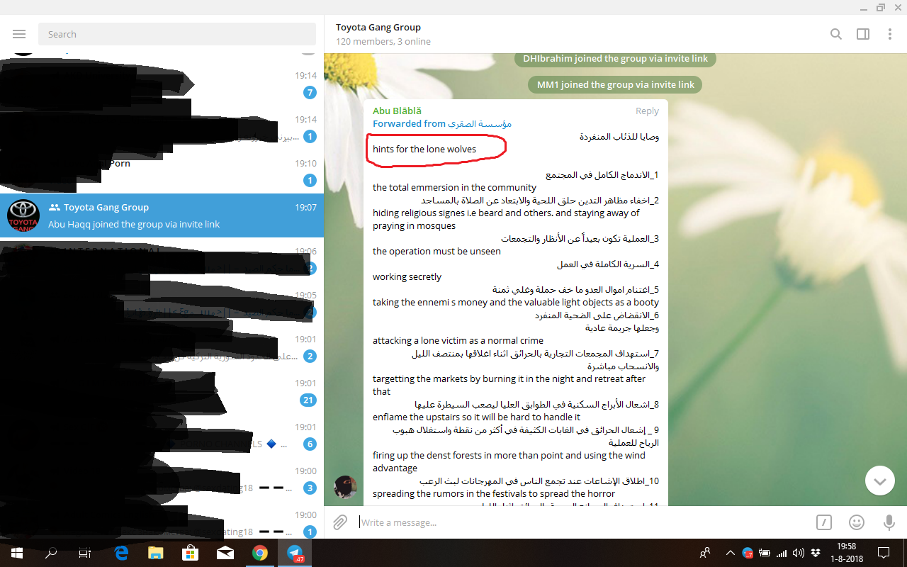 Een dag later maakt Abu Musa het beruchte lone wolve chatgroep kanaal answer the Call ofwel beandwoord de oproep aan en ja hoor wie is er dan weer tot mede beheerder van die groep gemaakt? Juist onze Mel zonder Kim wel es waar.